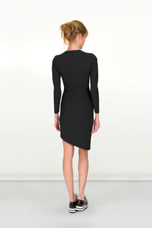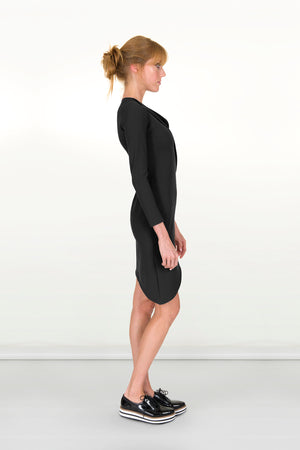 This dress sculpts the body comfortably and the asymmetrical hem elongates the figure for the perfect silhouette. It is constructed as a tailored piece with double lapels yet it feels soft and comfortable like gym wear. It can be dressed up or down with heels or flat shoes. Without any zips, buttons or labels. The ultimate travel essential as it packs very small and doesn't crease. If packed for prolonged time some creasing will occur but it relaxes with body heat. Machine washable and no iron. Doesn't fade, lint or lose shape wash after wash. No more expensive dry cleaning bills! Made in Italy with ultrasonic and thermal bonding technologies for smooth, stitchless finish. Made with our signature eco-certified carbon neutral Italian fabric that feels smooth on the skin, is hypoallergenic, breathable and provides UV protection. All the fabrics we use are comfortable, durable, made with non toxic dies in a water saving, non polluting process endorsed by WWF.