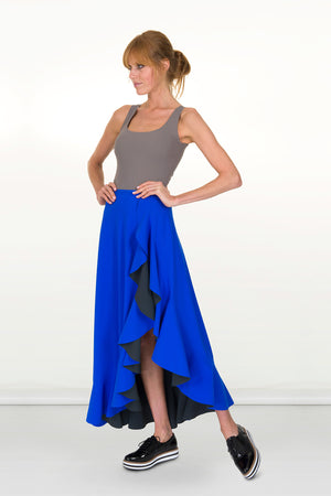 This raffled long reversible skirt is the ultimate in versatility and can be a skirt, a cape and a dress. it can be worn on the grey side with flashes of the electric blue showing with movement or on the cobalt side with grey showing. It is the perfect travel companion that can instantly put glamour into any outfit as well as be a beach dress. Wear it with a swimsuit on the beach, then add some spectacular jewellery and it can also be worn for a black tie event! Wear it with any of our dresses or with any of our trousers, leggings or skirts to make it fun or elegant. Without any zips, buttons or labels. If packed for prolonged time some creasing will occur but it relaxes with body heat. Machine washable and no iron. Doesn't fade, lint or lose shape wash after wash. No more expensive dry cleaning bills! Made in Italy with ultrasonic and thermal bonding technologies for smooth, stitchless finish. Made with our signature eco-certified carbon neutral Italian fabric that feels smooth on the skin, is hypoallergenic, breathable and provides UV protection. All the fabrics we use are comfortable, durable, made with non toxic dies in a water saving, non polluting process endorsed by WWF.